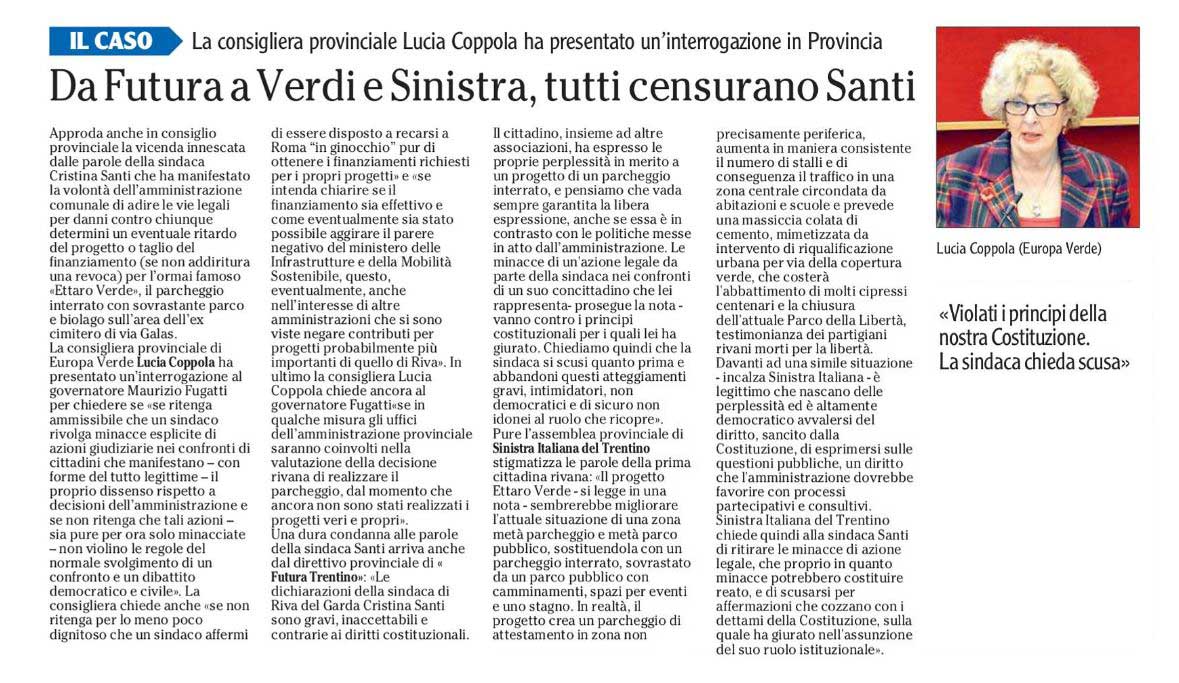Premesso che: – si apprende dai mezzi di informazione che la sindaca di Riva ha minacciato azioni legali contro chiunque cerchi di impedire la realizzazione di un mega parcheggio interrato al posto dell’attuale Parco della Libertà; – è opportuno richiamare il primo comma dell’art. 21 della Costituzione che afferma che “Tutti hanno diritto di manifestare liberamente il proprio pensiero con la parola, lo scritto e ogni altro mezzo di diffusione.”; – è noto che contro la realizzazione del progetto si sono espressi consiglieri comunali di Riva del Garda, esponenti di associazioni locali che si occupano, in generale, della tutela ambientale e esponenti di due gruppi parlamentare (SI e PD); – gli Amici della Terra di Riva del Garda hanno promosso una raccolta firme in calcio ad una petizione rivolta alla sindaca per rappresentare le negatività e le criticità nel caso l’intervento fosse realizzato; – appare difficilmente sostenibile che l’intervento in questione possa considerarsi un atto migliorativo dell’ambiente naturale quando prevede il taglio di decine di alberi (alcuni dei quali ultracentenari), per realizzare un parcheggio interrato multipiano ed altri edifici esterni, oltre ad un piccolo praticello ed un laghetto (290 mq e 50 cm di profondità) idoneo al massimo per pesci rossi; – una comunicazione del dirigente del servizio legislativo del Ministero delle Infrastrutture e della Mobilità Sostenibile esclude che il progetto rientri tra quelli finanziati con il Pnrr; – la sindaca di Riva del Garda e l’assessore competente affermano invece che il finanziamento è stato inserito nell’elenco dei progetti finanziati; si interroga il Presidente della Provincia di Trento per sapere: 1. se ritenga ammissibile che un sindaco rivolga minacce esplicite di azioni giudiziarie nei confronti di cittadini che manifestano – con forme del tutto legittime – il proprio dissenso rispetto a decisioni dell’Amministrazione e se non ritenga che tali azioni – sia pure per ora solo minacciate – non violino le regole del normale svolgimento di un confronto e un dibattito democratico e civile; 2. se non ritenga invece per lo meno poco dignitoso che un sindaco affermi di essere disposto a recarsi a Roma “in ginocchio” pur di ottenere i finanziamenti richiesti per i propri progetti (cfr l’Adige, 29 dic. 2021); 3. se intenda chiarire se il finanziamento sia effettivo e come eventualmente sia stato possibile aggirare il parere negativo del Ministero delle Infrastrutture e della Mobilità Sostenibile, questo, eventualmente, anche nell’interesse di altre amministrazioni che si sono viste negare contributi per progetti probabilmente più importanti di quello di Riva; 4. se in qualche misura gli uffici dell’Amministrazione provinciale saranno coinvolti nella valutazione della decisione rivana di realizzare il parcheggio, dal momento che ancora non sono stati realizzati i progetti veri e propri.