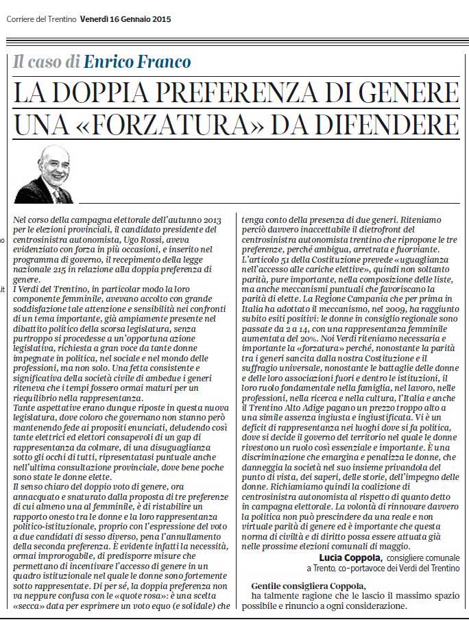 lettera di Lucia Coppola, Co-portavoce dei Verdi del Trentino