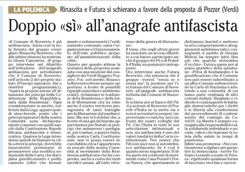 DOPPIO «SI» ALL'ANAGRAFE ANTIFASCISTA